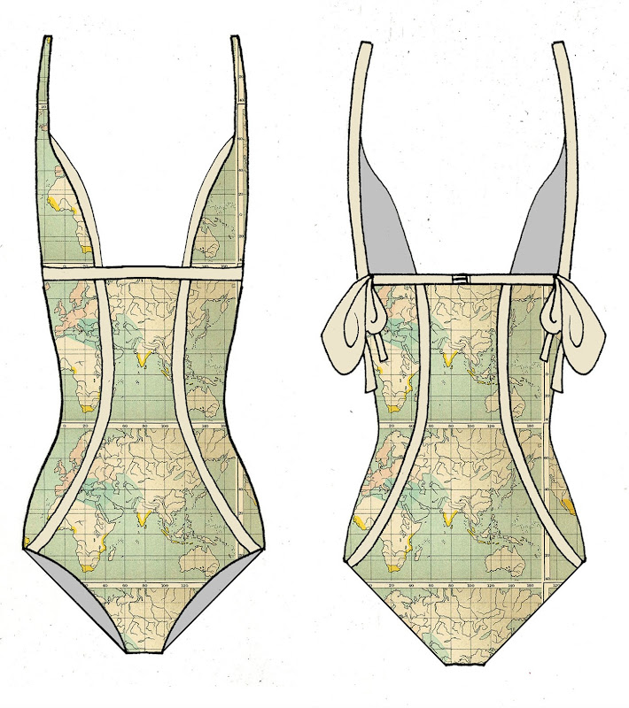 Anyway to cure my summer fever I designed some swimsuits inspired by summer travel (i.e. maps and the ocean) hope you enjoy....